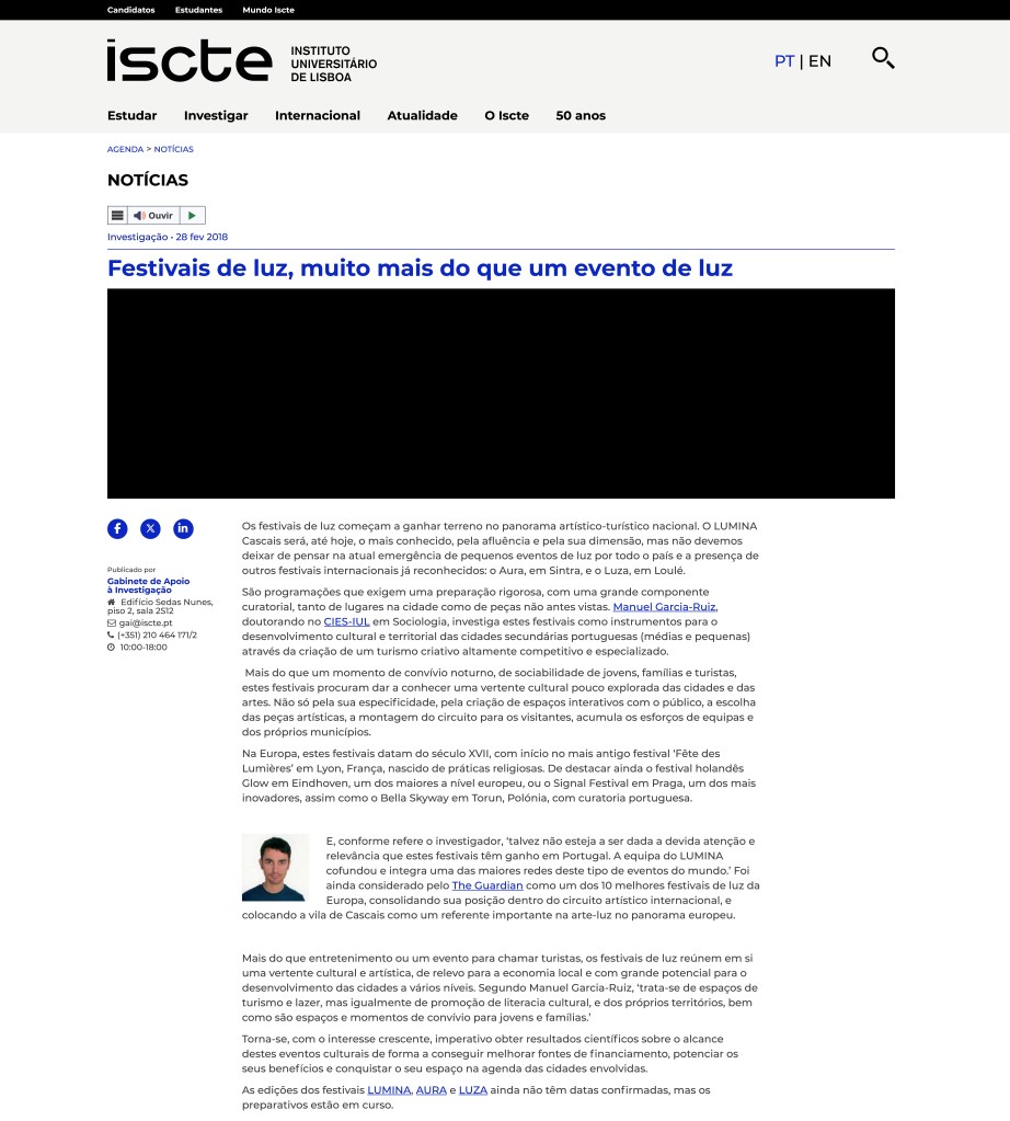 I’m delighted to share that ISCTE – Instituto Universitário de Lisboa has published an article on its official website spotlighting my research on light festivals. The piece, titled “Festivais de luz, muito mais que evento de luz”, presents light festivals not merely as entertainment but as powerful tools for urban, cultural, and territorial transformation.