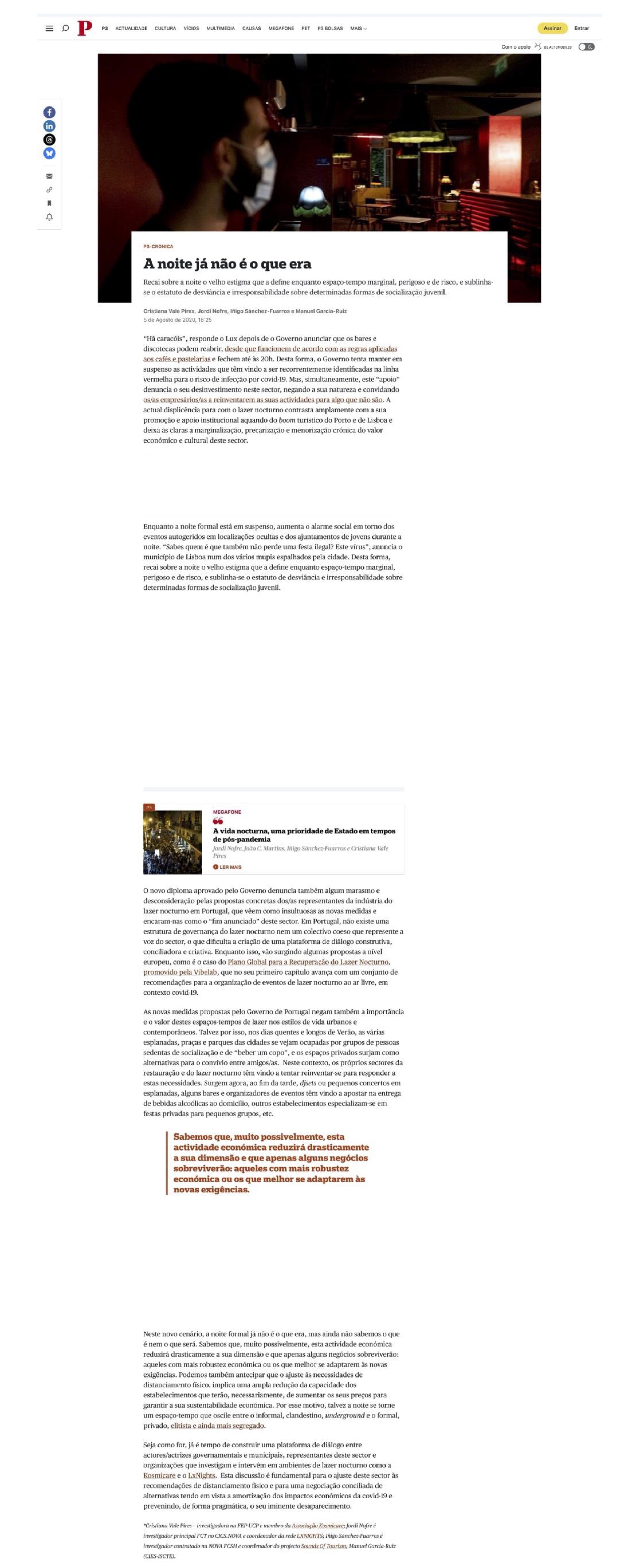 I’m pleased to share that my article “The Night Is No Longer Ours” was published in the Portuguese newspaper Público, via its P3 platform dedicated to culture and contemporary thought.
