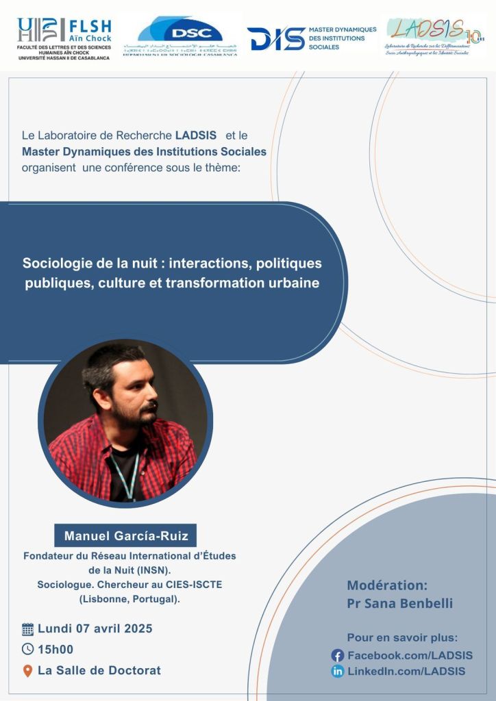 On April 7, 2025, I was invited to deliver a conference titled “Sociologie de la nuit: interactions, politiques publiques, culture et transformation urbaine” at Université Hassan II de Casablanca. The event was hosted by the Laboratoire de Recherche LADSIS and the Master in Social Institutions Dynamics (DIS).