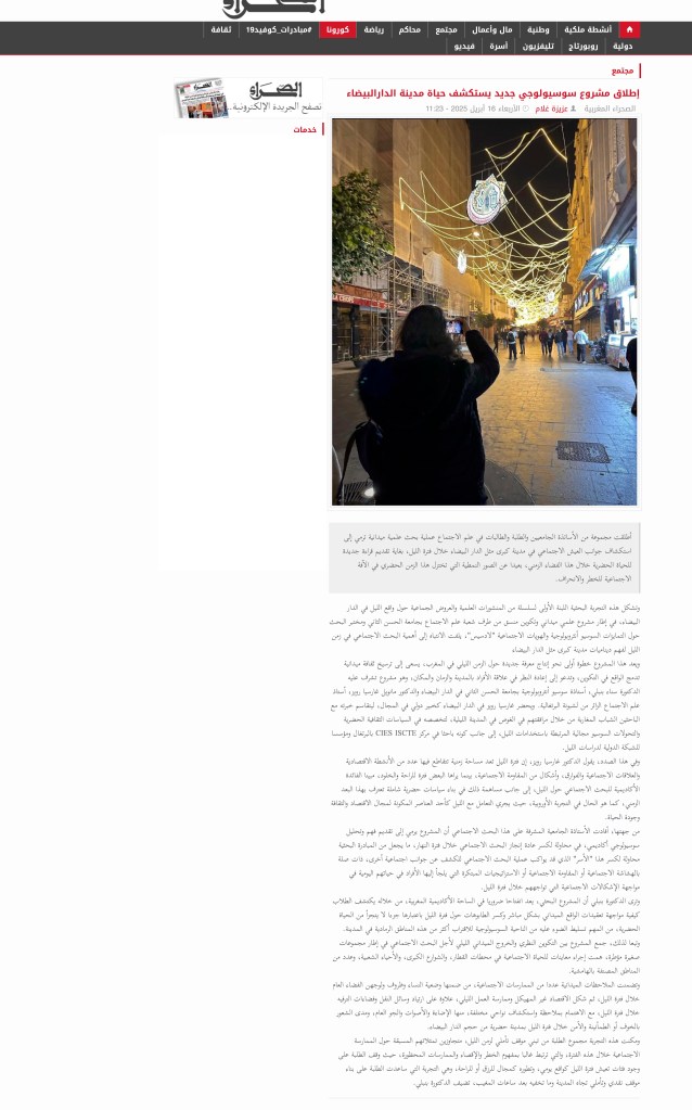 A group of university professors and sociology students has launched a field research initiative aimed at exploring aspects of social life in a major city like Casablanca during the night. The project seeks to offer a new reading of urban life during this time-space, moving beyond stereotypes that reduce the urban night to a social affliction associated with danger and deviance.
